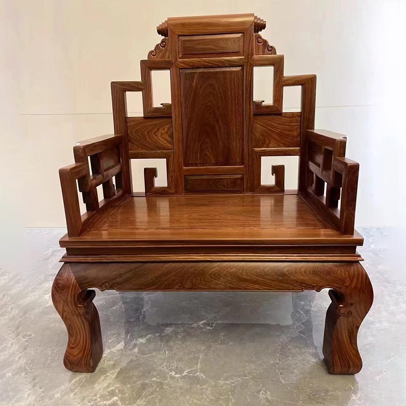 A kínai klasszikus szélesített irodai szék csodálatos formájú és kifinomult dizájnnal rendelkezik. Olyan, mint egy trón, fenséges és nemes légkört áraszt. A széken ülve páratlan tiszteletet érezhet. Nem csak egy bútor, hanem a státusz szimbóluma is. Kényelmes pihenőhelyet biztosít, és megmutatja ízlését és állapotát is. Válassza ezt a széket, válassza a Chuantianjiang Redwood Factory kiváló minőségét, és hagyja, hogy élete méltóságban és luxusban legyen. A nagy gyümölcsű vörös szantálfa természetes textúrája olyan, mint a folyó felhők és a víz, a színe pedig meleg és lágy. A fenséges forma, a magas háttámla és a széles karfák a király fenségét közvetítik.