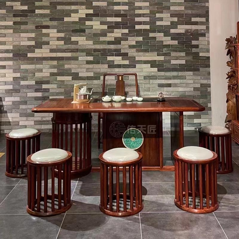 A rácselemek integrálása hagyományos bájt és térbeli rétegzettséget kölcsönöz. A türkiz díszítése, mint egy kis csillagfény, egy csipetnyi intelligens színt visz a teaasztalra. Az ülés bőrből készült, puha textúrája kényelmesebb ülésérzetet biztosít. A kínai stílusú rózsafa fából készült klasszikus teaasztal egyszerű dizájnjával, de gazdag elemeivel ideális választás teakóstolókhoz és szabadidős tevékenységekhez.